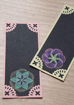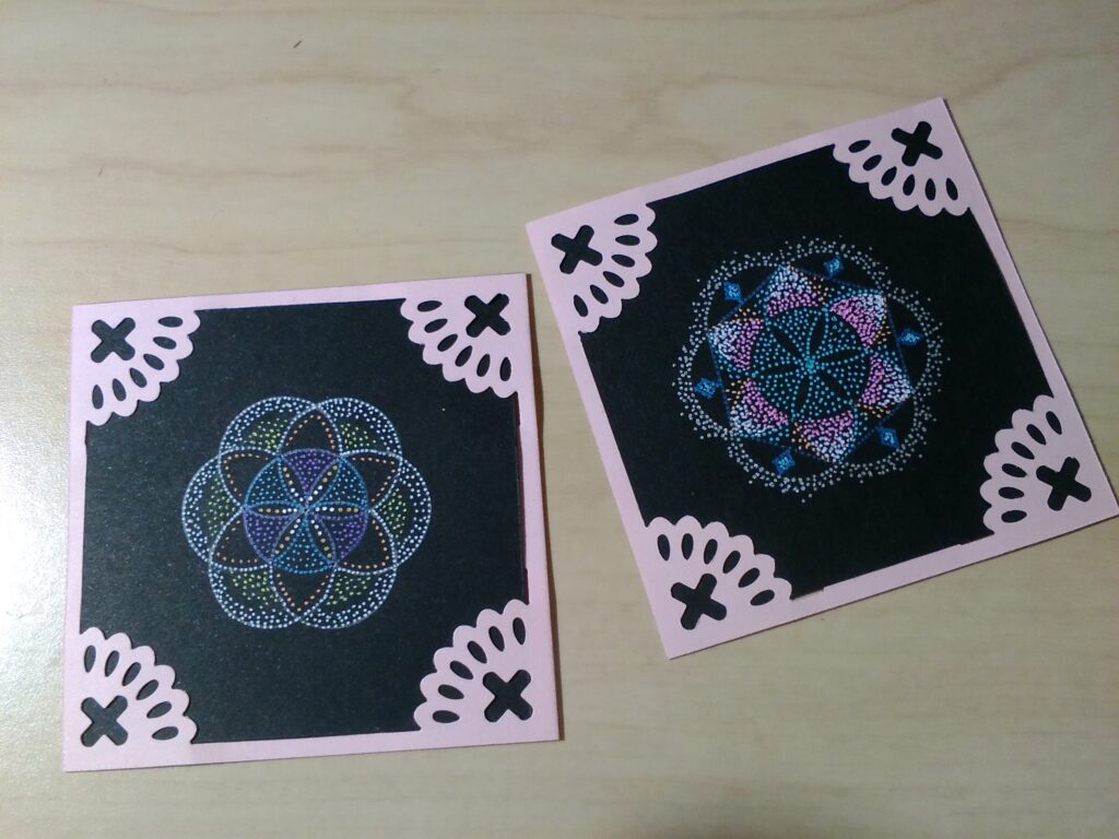 <宙を奏でる点描曼荼羅画>の下図に宙奏曼荼羅の約束事に沿って色ペンで点描していく、いわば点描塗り絵のようなものです。